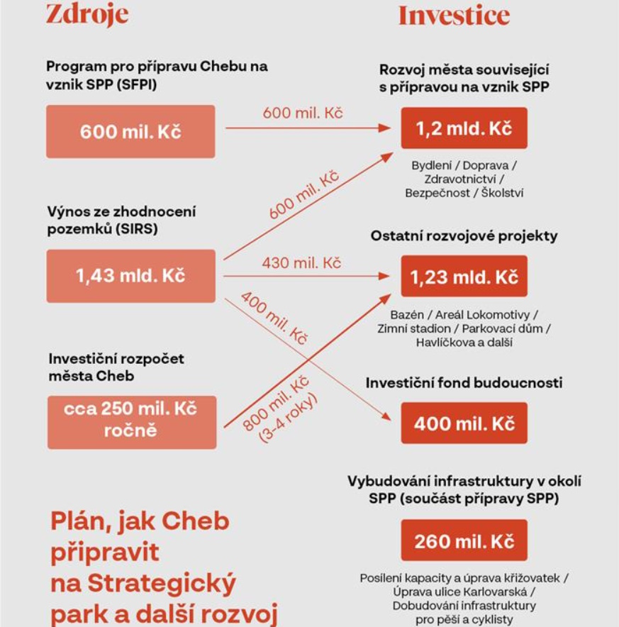Případný vznik Strategického podnikatelského parku Cheb vyvolává potřebu posílení městské infrastruktury. Zároveň přináší také prostředky určené k přípravě města na jeho rozvoj. A to není vše. Přináší i prostředky “navíc” představující jedinečnou příležitost k dalšímu rozmachu. Celkově jde o 2 miliardy korun, které v kombinaci s dalšími zdroji, jako jsou přímé investice v okolí Parku a investiční rozpočet města, tvoří výrazný balík financí. Díky tomu je možné v následujících 5-7 letech investovat do rozvoje našeho města přes 3 miliardy korun. Pokud bychom tato opatření investovali bez Parku, při současném rozpočtu by nám to trvalo zhruba 12-15 let.